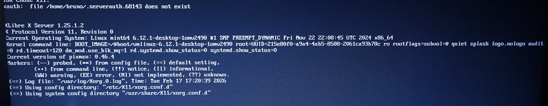 - Al riavvio, indifferentemente dal kernel che uso, la macchina funziona solo in modalità «console mode» e nemmeno molto bene, infatti non funziona lo scorrimento indietro con «Maiuscolo+PagSU»