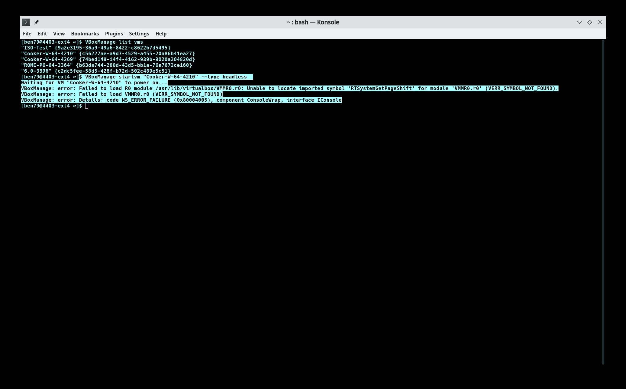 I am in a fresh install of ROME P6 X11 x86_64 iso #4403. Need to install an older kernel and see if that will at least have the kernel modules. If it does that is one problem but there is another problem and I am fairly certain VirtualBox is broken.