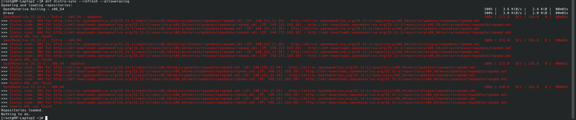 >>> Status code: 404 for http://mirror.openmandriva.org/25.11-1/repository/x86_64/main/release/repodata/repomd.xml (IP: 140.211.11.99) - http://mirror.openmandriva.org/25.11-1/repository/x86_64/main/release/repodata/repomd.xml