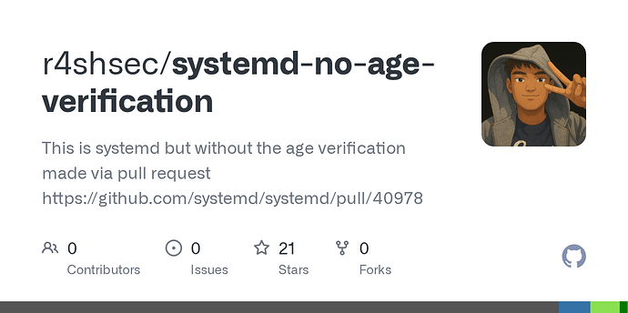 While we don’t have systemd-free OpenMandrive, I hope the fixes and forks for the age stuff will be pulled into our distros as well. Albeit have to note that r4shsec might have a “tantrum fork” unless at least like 3-12 people commit to it on a regular basis.