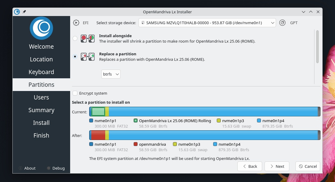 When I went through the Calamares installer, I tried going with the “Replace a Partition” option in the below screenshot, and I selected the root partition as the one to replace.