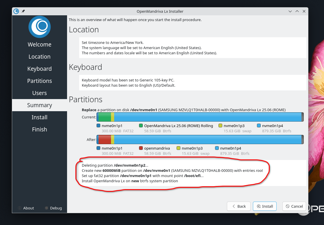 When I reached the Summary page of the installer, I noticed that there was nothing about the home partition mentioned, but I figured that, since I wasn’t replacing it, the fact that it wasn’t mentioned was fine.