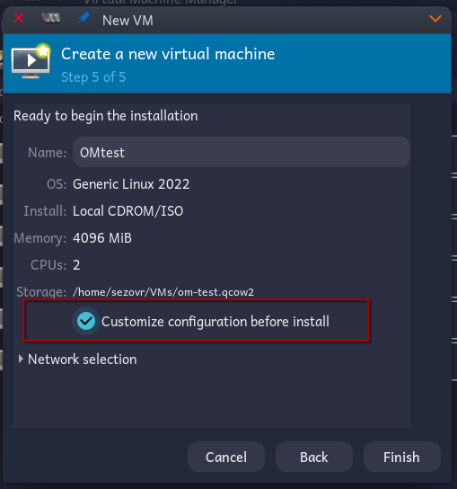 Give your VM a name (it defaults to “linux2022”, which you don’t want), and VERY IMPORTANT: select Customize configuration before install.