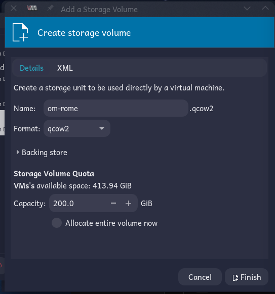 Unfortunately, the storage pool that’s configured by default points to a folder in your system’s var directory. This is not a good default, and not a good place in which to store disk images. You will, therefore have to configure two storage pools.