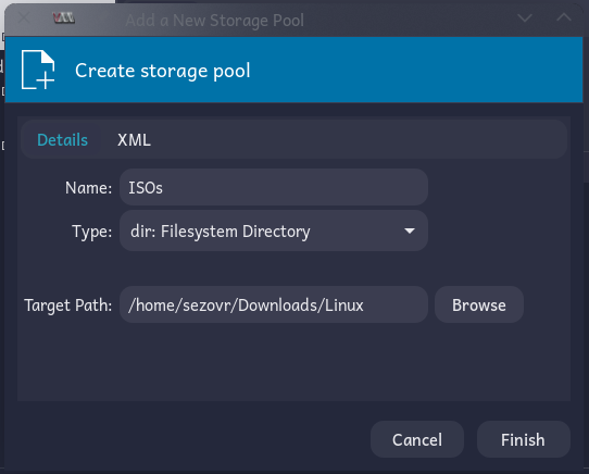 In the dialog that appears, give your storage pool a name. Then click the Browse button and navigate to the directory you created above for your downloaded ISOs. Click Finish. Your first storage pool is created.