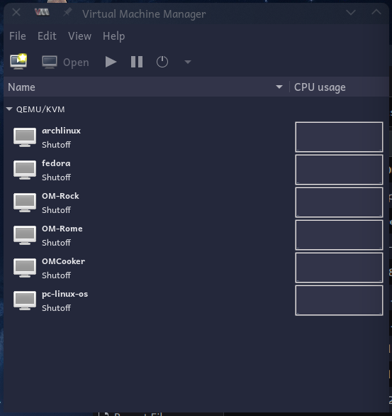 libvirtd.servicerunning. By default in OpenMandriva, this is already set to run on boot. Since you have to reboot anyway after modifying the groups in the previous step, reboot now.
