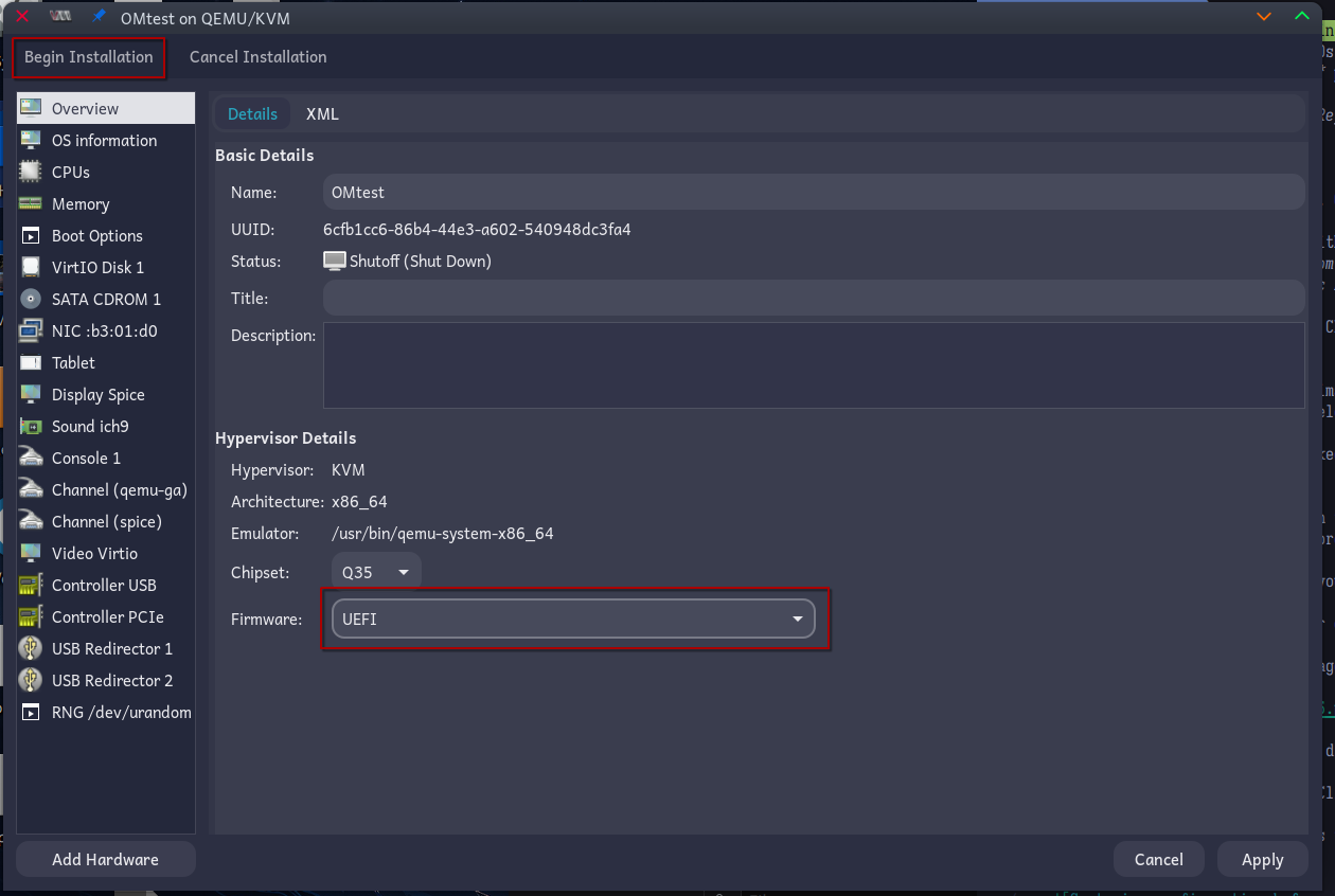 Now the VM configuration dialog appears. At the bottom is a drop-down for choosing the firmware. It defaults to BIOS. Choose UEFI instead, and then click Begin Installation.